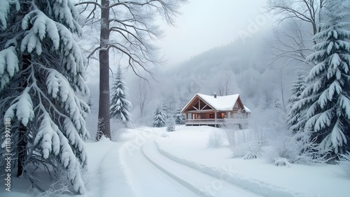 © Shahina, Naklejka premium Serene Winter Wonderland, Snow Covered Trees, Cozy Cabin, Snowy Road - AI Generated Image