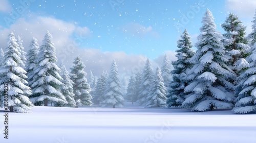 Naklejka premium Serene Winter Wonderland with Snow-Covered Pine Trees under a Bright Blue Sky and Soft Flurries of Snowfall in a Peaceful Natural Landscape