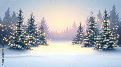Fototapeta premium Serene Winter Wonderland with Snow-Covered Trees and Soft Glow of Decorative...