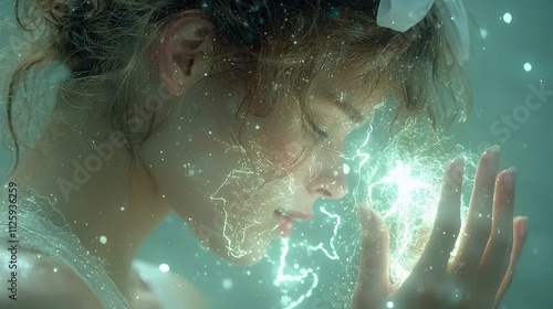 © Narongsag, Fototapeta premium Serene Woman Gathering Glowing Energy Mystical Art Fantasy Portrait