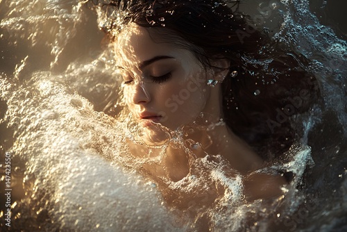 Fototapeta premium Serene woman immersed in water with eyes closed in a moment of peaceful...