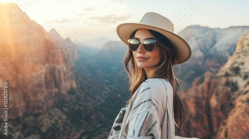 © HIRA STOCK, Naklejka premium Serene woman in hat and sunglasses enjoying breathtaking canyon vista during golden hour sunset in peaceful nature setting embodying travel and adventure