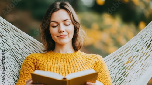 Obraz premium Serene Woman in Yellow Sweater Relaxing in Hammock, Enjoying a Book and...