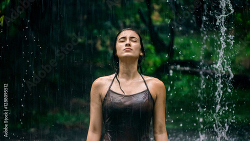© Alexander Reitter, Obraz premium Serene Woman Standing by Waterfall Amid Lush Greenery Enjoying Nature's Serenity
