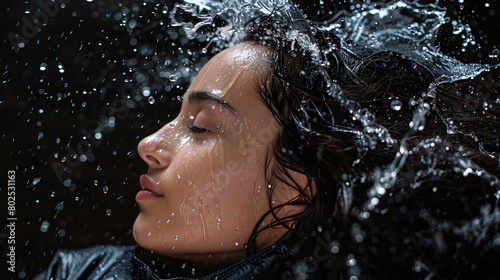 Obraz premium Serene Woman with Wet Hair in Rain Close Up Peaceful Expression