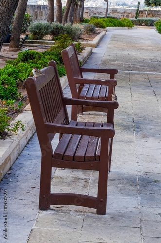 © Elena, Obraz premium Serene Wooden Benches in a Quiet Garden Pathway