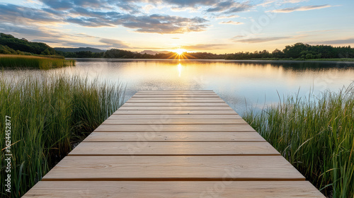 © siraphol, Naklejka premium Serene wooden boardwalk extends over tranquil lake, surrounded by lush greenery, as sun sets