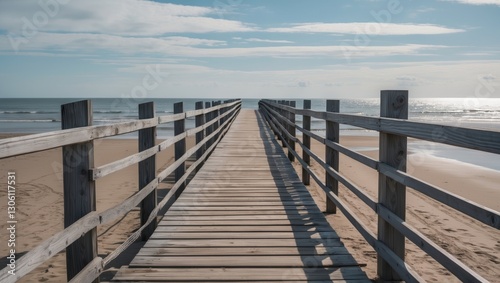 Naklejka premium Serene Wooden Boardwalk Leading Towards Tranquil Beach and Ocean Under Clear...