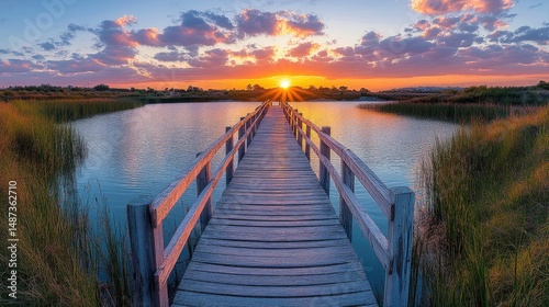 © Aris, Fototapeta premium Serene wooden boardwalk leads to a vibrant sunset over a tranquil lake