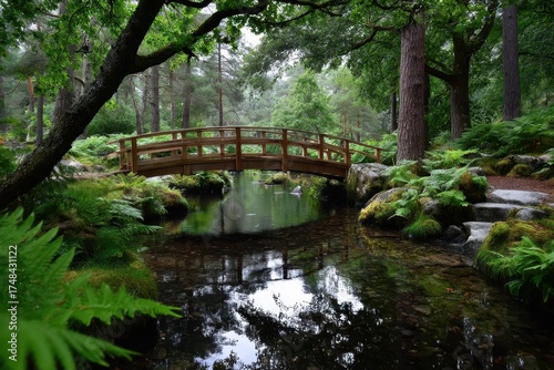 Obraz premium Serene wooden bridge over a tranquil stream surrounded by lush greenery in a...
