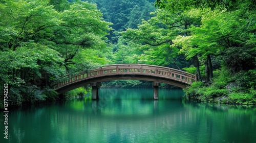 © Adiba sakila atmarin, Fototapeta premium Serene Wooden Bridge over Emerald Lake in Lush Forest