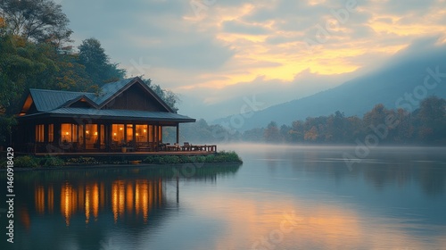 © iam, Fototapeta premium Serene wooden cabin by tranquil lake at dawn.