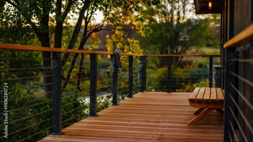 © VibrantLens, Fototapeta premium Serene wooden deck overlooking lush greenery at sunset.