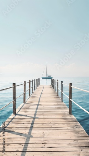 © decorator, Fototapeta premium Serene wooden dock extending into tranquil blue sea with distant sailboat under clear sky