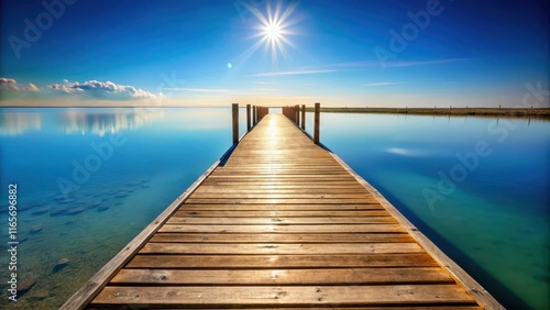 Obraz premium Serene wooden dock extending over tranquil blue water, bathed in the golden light of a radiant sun, creating a picturesque summer scene.