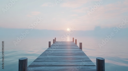 © Anak, Fototapeta premium Serene wooden dock extends into a hazy sunrise.