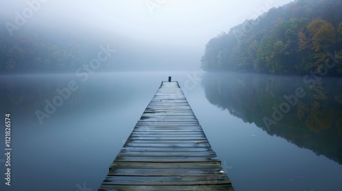 © Oleg, Fototapeta premium Serene wooden path leading to a tranquil lake nature landscape for minimalist wallpaper