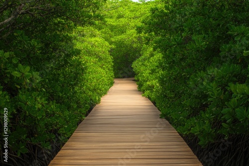 Fototapeta premium Serene wooden pathway winding through lush greenery invites expl