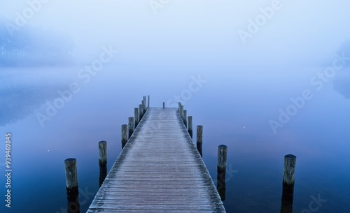 © N.Coleman, Obraz premium Serene Wooden Pier Extending into a Misty Lake at Sunrise