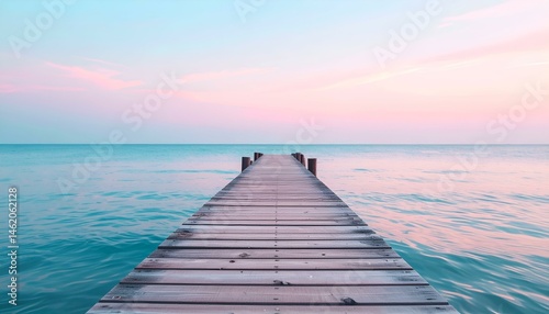 Fototapeta premium Serene wooden pier extending into a tranquil turquoise sea under a pastel...