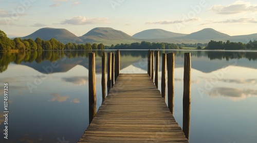 Naklejka premium Serene Wooden Pier Extending into Calm Lake Under Bright Sky Surrounded by...