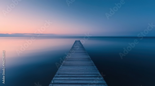 © FoxGrafy, Naklejka premium Serene Wooden Pier Extending into Calm Ocean at Sunset with Clear Sky and Gentle Horizon