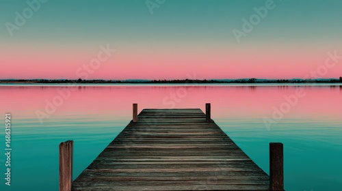 © Chanwit, Fototapeta premium Serene wooden pier extending into calm reflective lake du vibrant colorful sunset with pink orange and teal sky