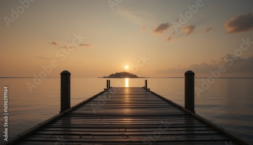 © Pungkas, Fototapeta premium serene wooden pier extending into calm water during tranquil sunset with distant island