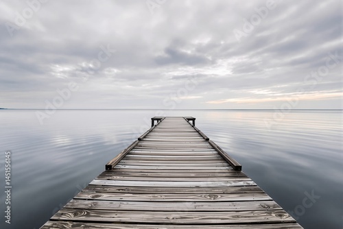 © peshkova, Obraz premium Serene wooden pier extending into calm water under a cloudy sky.