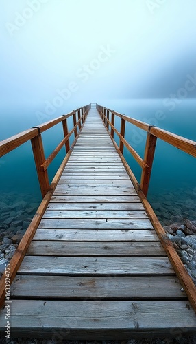 Obraz premium Serene Wooden Pier Extending into Tranquil Teal Lake Surrounded by Misty Fog...