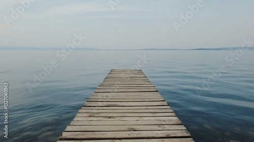 Fototapeta premium Serene wooden pier extending over still waters reflecting surrounding calm...