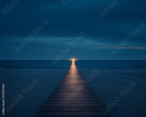 © chok, Obraz premium serene wooden pier extends into calm ocean at dusk, reflecting light