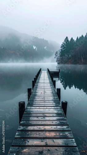 © Kitta Studio, Fototapeta premium Serene Wooden Pier Over Calm Water in Misty Forest Landscape