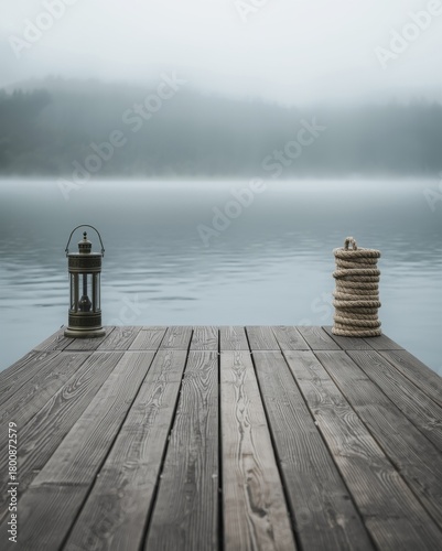 © Gustav, Fototapeta premium Serene Wooden Pier with Lantern and Rope on a Foggy Lake Morning