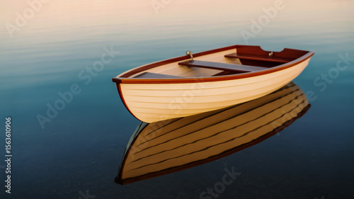 © Mst Rozina Pervin, Naklejka premium Serene Wooden Rowboat on Calm Water at Sunset