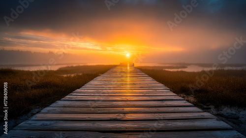 © Daria, Fototapeta premium Serene wooden walkway extending across wetlands at sunrise, capturing the peaceful transition from night to day with vibrant orange and yellow hues illuminating the sky