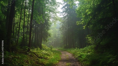 Fototapeta premium Serene Woodland Path Illuminated by Sunlight Streaming Through Lush Green...