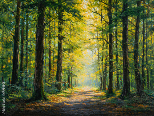 Obraz premium Serene woodland pathway bathed in golden sunlight, surrounded by tall trees with lush green and yellow leaves, evoking tranquility and connection with nature
