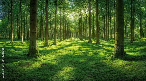 © Konde, Obraz premium Serene Woodland Scene with Sunlight Filtering Through Lush Green Trees