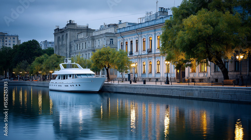 Naklejka premium "Serene Yacht at Odessa Port with Waterfront Charm"