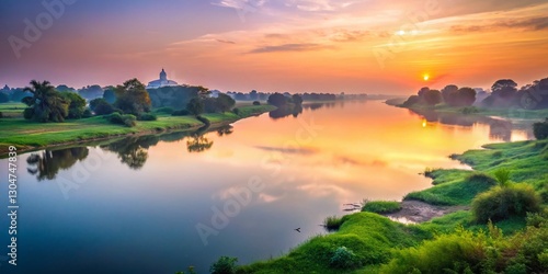 © Four888, Obraz premium Serene Yamuna River Landscape: Dawn in India's Sacred Waters