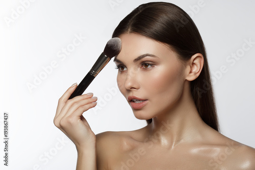 Obraz premium Serene young lady applying powder on forehead by brush with concentration....