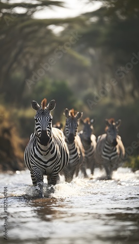 © decorator, Obraz premium Serene zebra crossing reveals African wildlife beauty bathed in gentle sunlight reflections