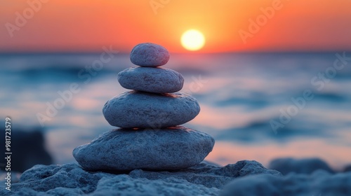 © LAB.Photo, Fototapeta premium Serene Zen Stone Stacking at Sunset by the Ocean