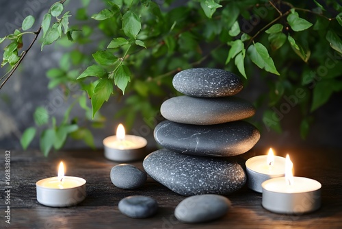 Obraz premium Serene Zen Stone Tower with Lit Candles and Lush Greenery, Tranquil Spa Scene.