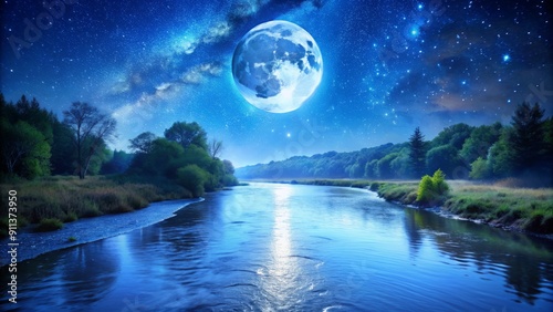 Fototapeta premium Serenene night scene featuring a tranquil blue river flowing gently under a...