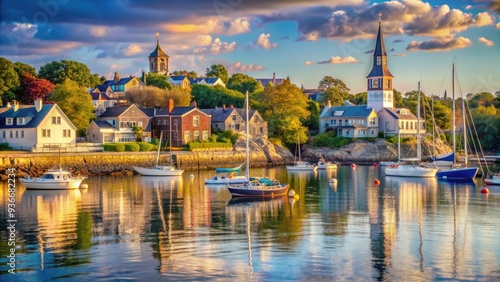 Fototapeta premium Serenene waterfront scene of historic Marblehead, Massachusetts, featuring charming colonial-era architecture, sailboats, and a tranquil harbor with gentle waves and crystal-clear water.