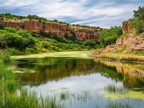 Fototapeta premium Serenity along the tranquil river in the lush canyon during a cloudy afternoon