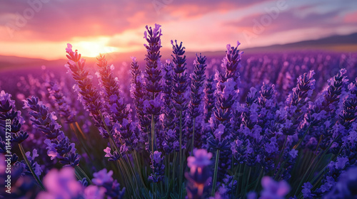 © Asree, Naklejka premium Serenity at Dawn: Lavender Fields at Sunrise