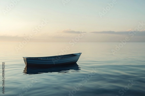 © Adi, Naklejka premium Serenity at Sea: A Boat Floating on Tranquil Waters at Dawn